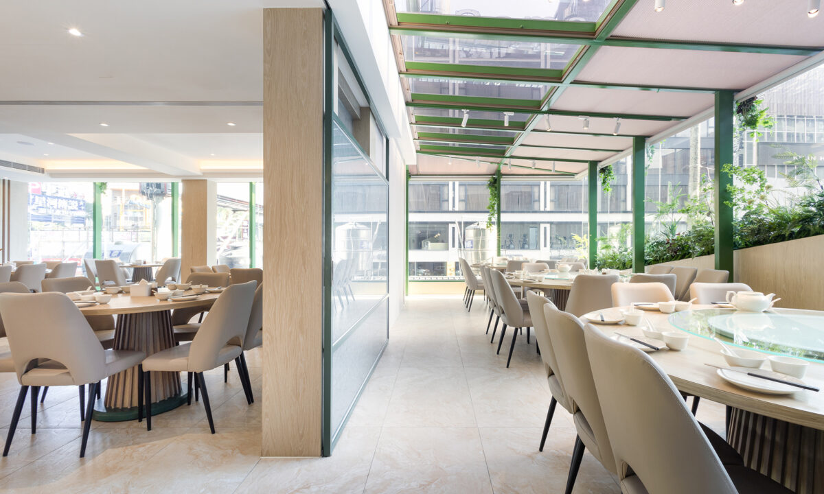 二樓採用大面積玻璃帷幕與植栽設計,搭配柔和木紋與自然光線,營造出明亮通透、清新自然的用餐氛圍。無論是白天沐光、或夜晚燈影交錯,都展現出獨特的溫潤美感。