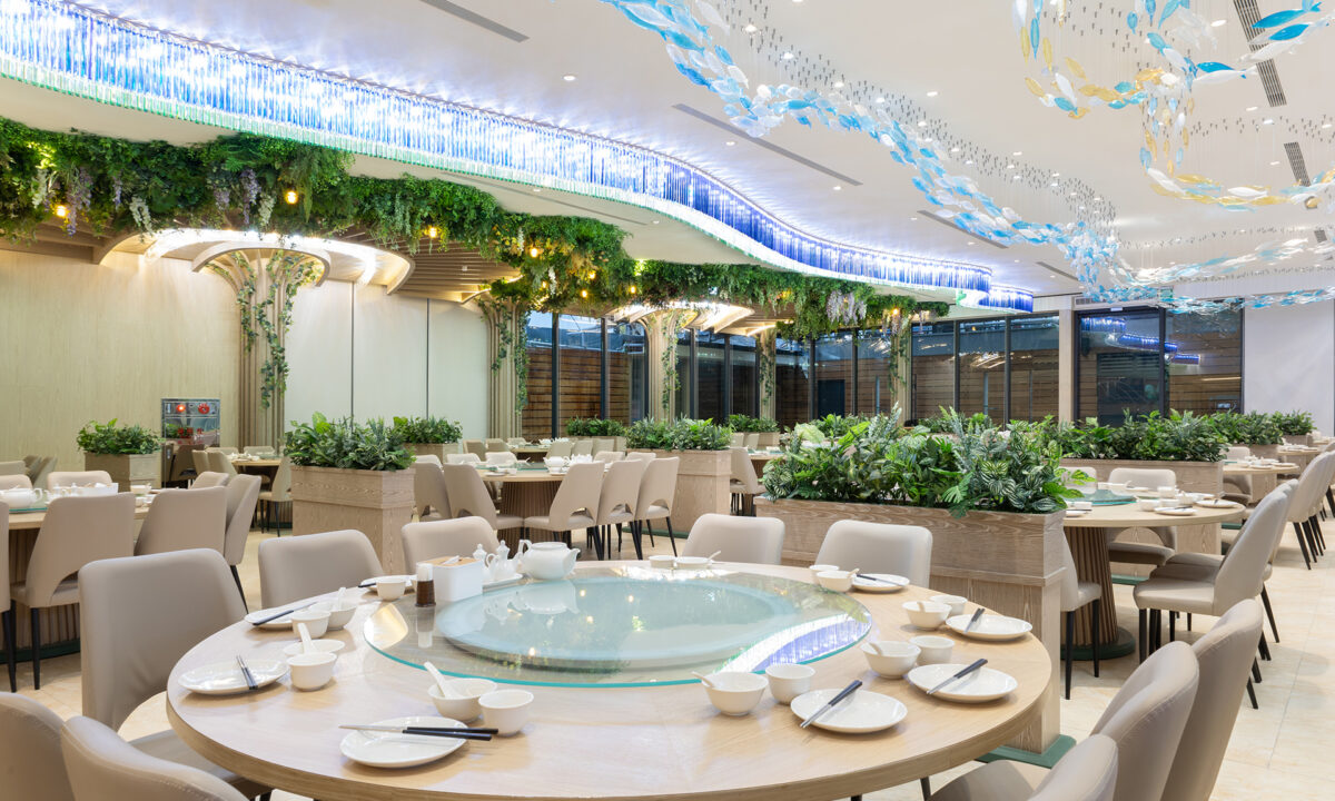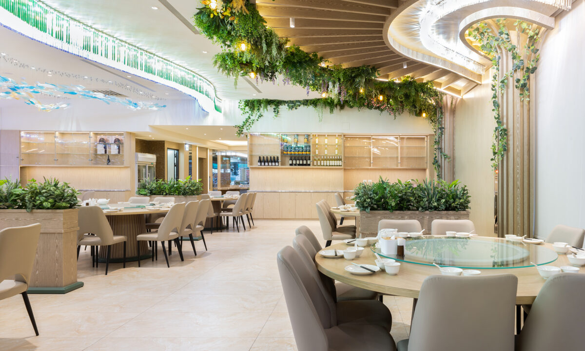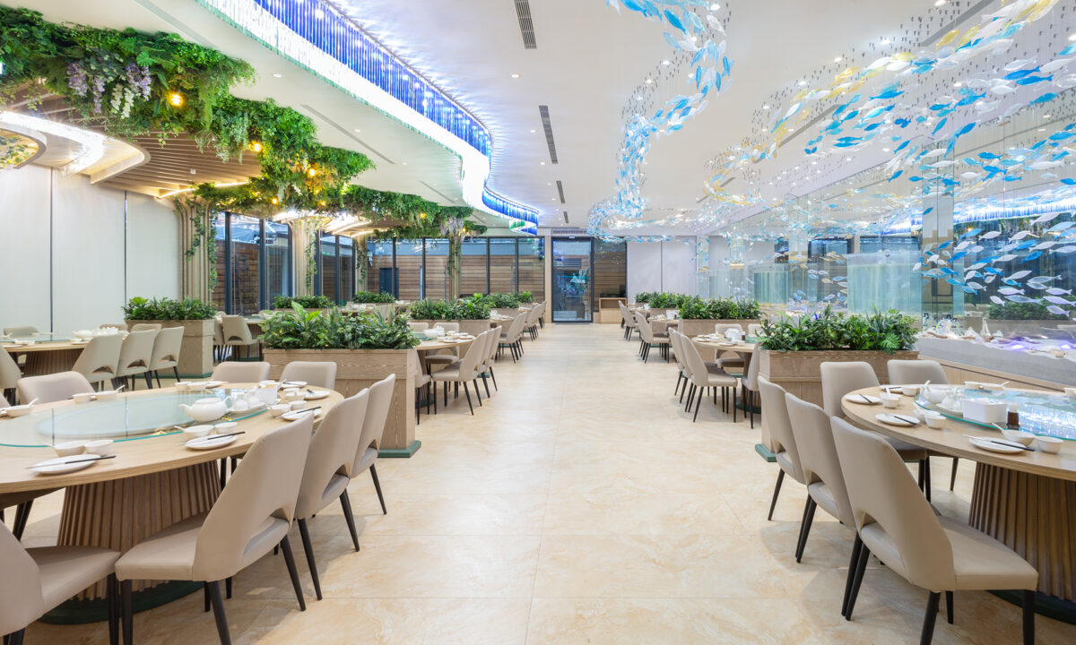 在寬敞挑高、光影流動的空間中,森林的綠意與海洋的悠藍交織共舞,打造出一樓左右區域各具風情的用餐環境。左側以自然藤蔓與植栽營造靜謐綠林氛圍,右側則以流動的魚群與水光折射展現海洋的靈動與清新。